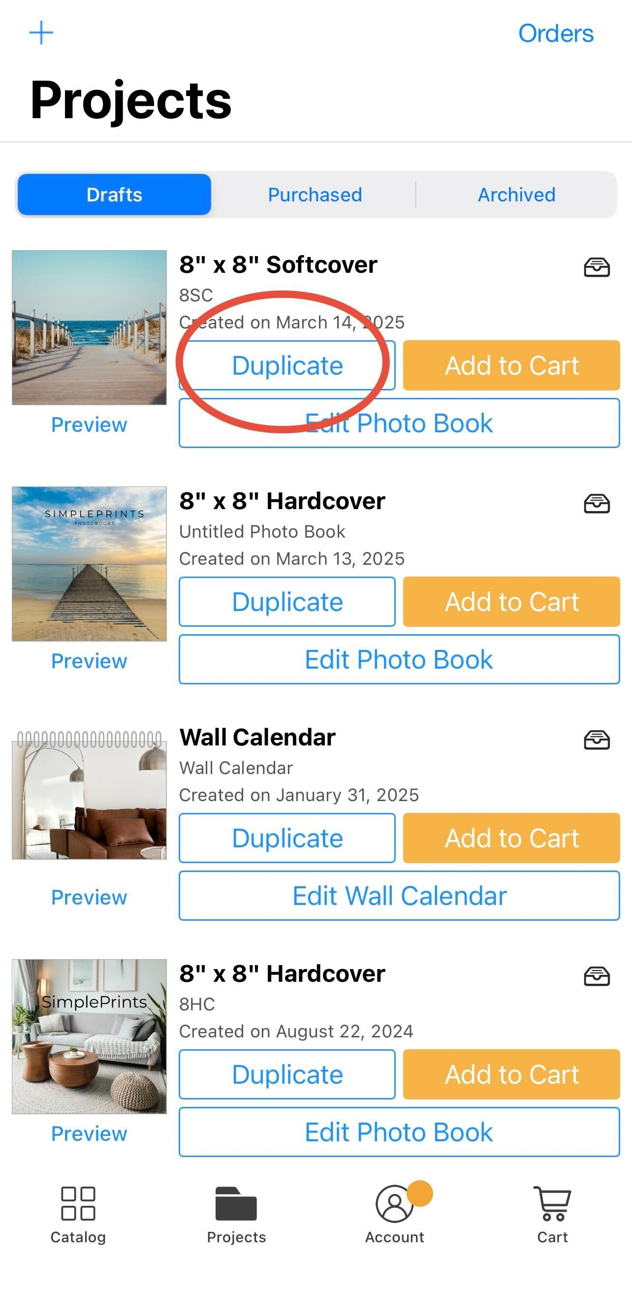 Locate your project in Drafts on the Projects tab in the SimplePrints app. If you've already purchased your book, you may need to toggle over to the Purchased tab. Using the Duplicate button next to your project in the app, create as many duplicates as the number of new books you'd like to create. The new, duplicated project will be located in Drafts with the word (Copy) in front of it's name project name.