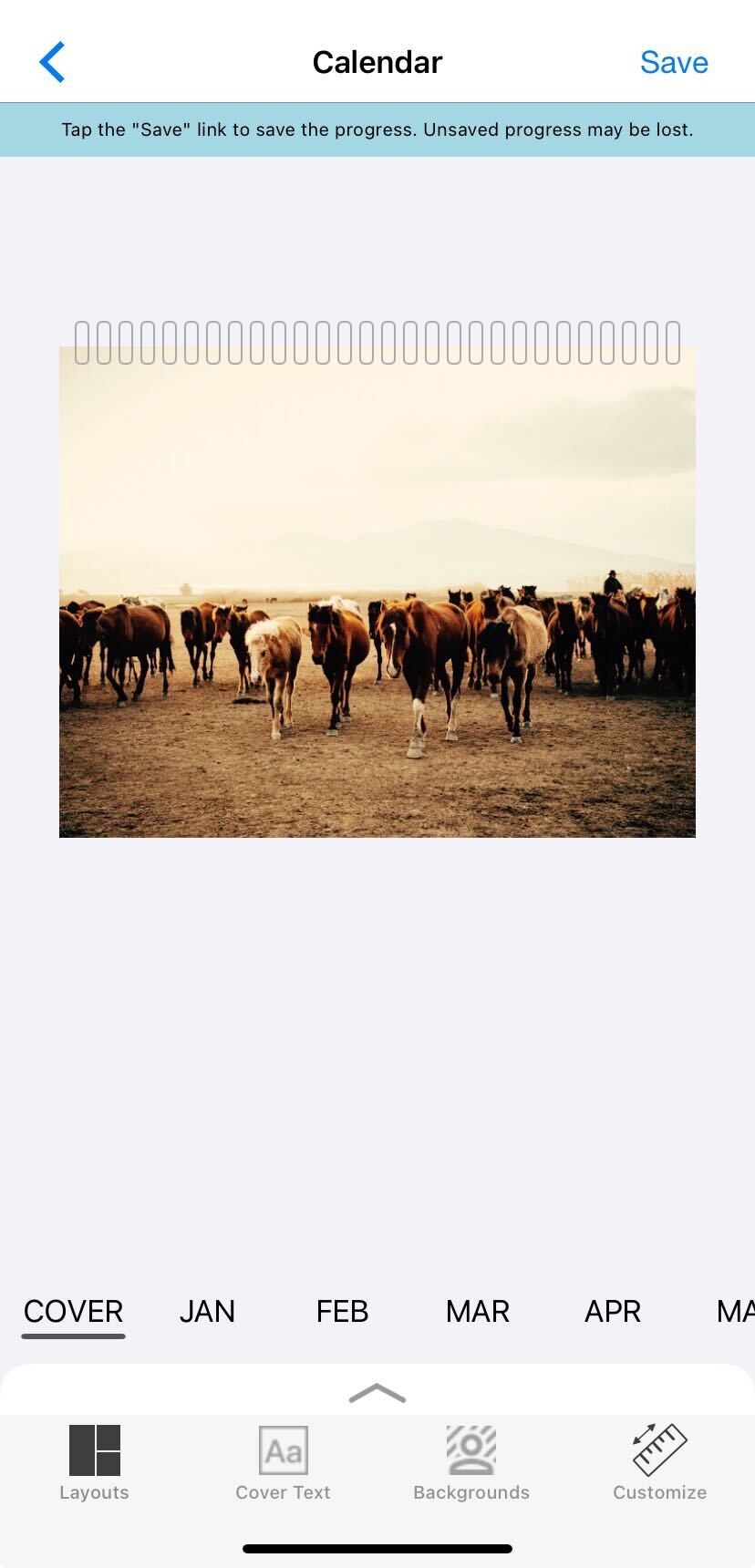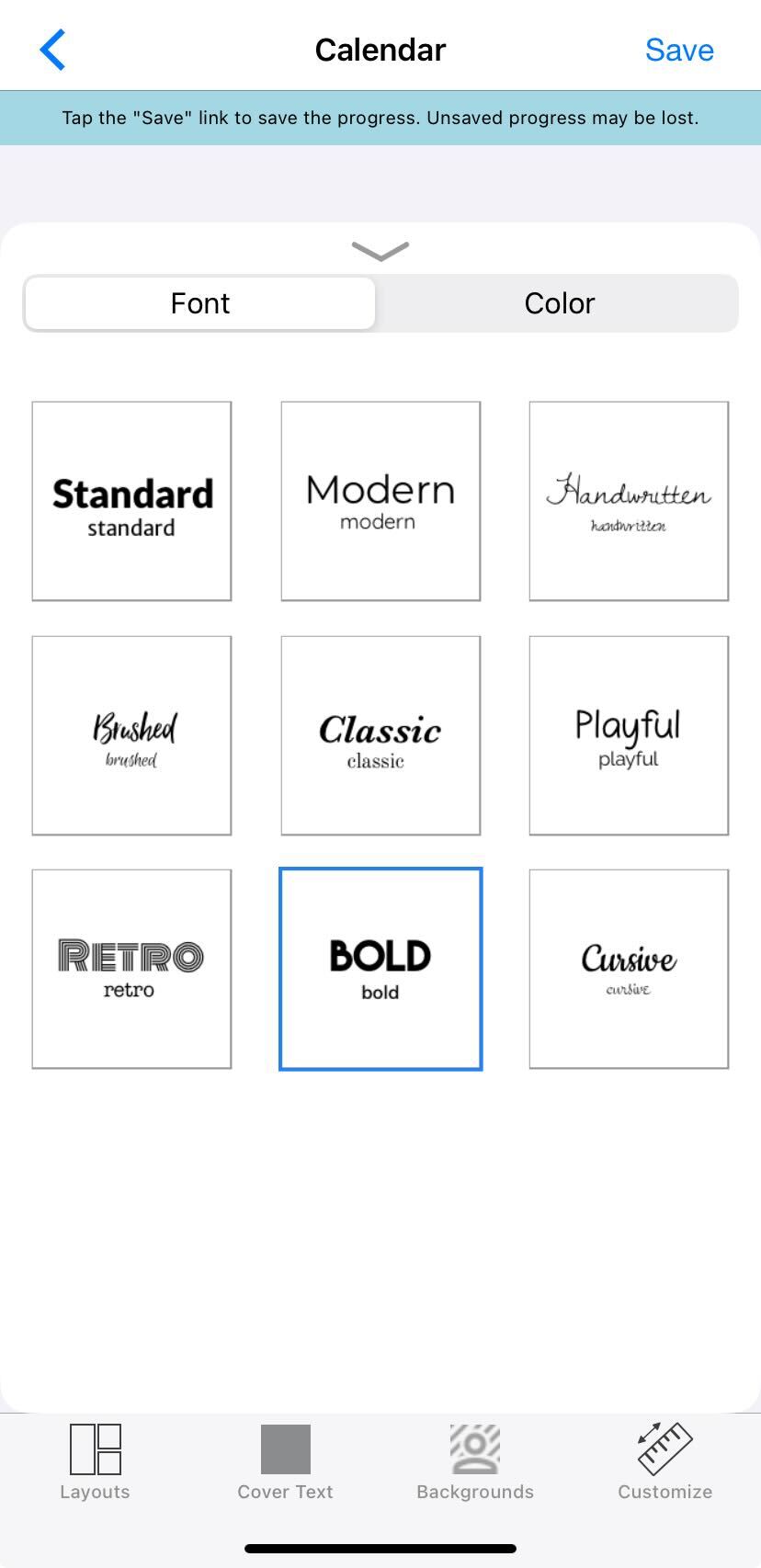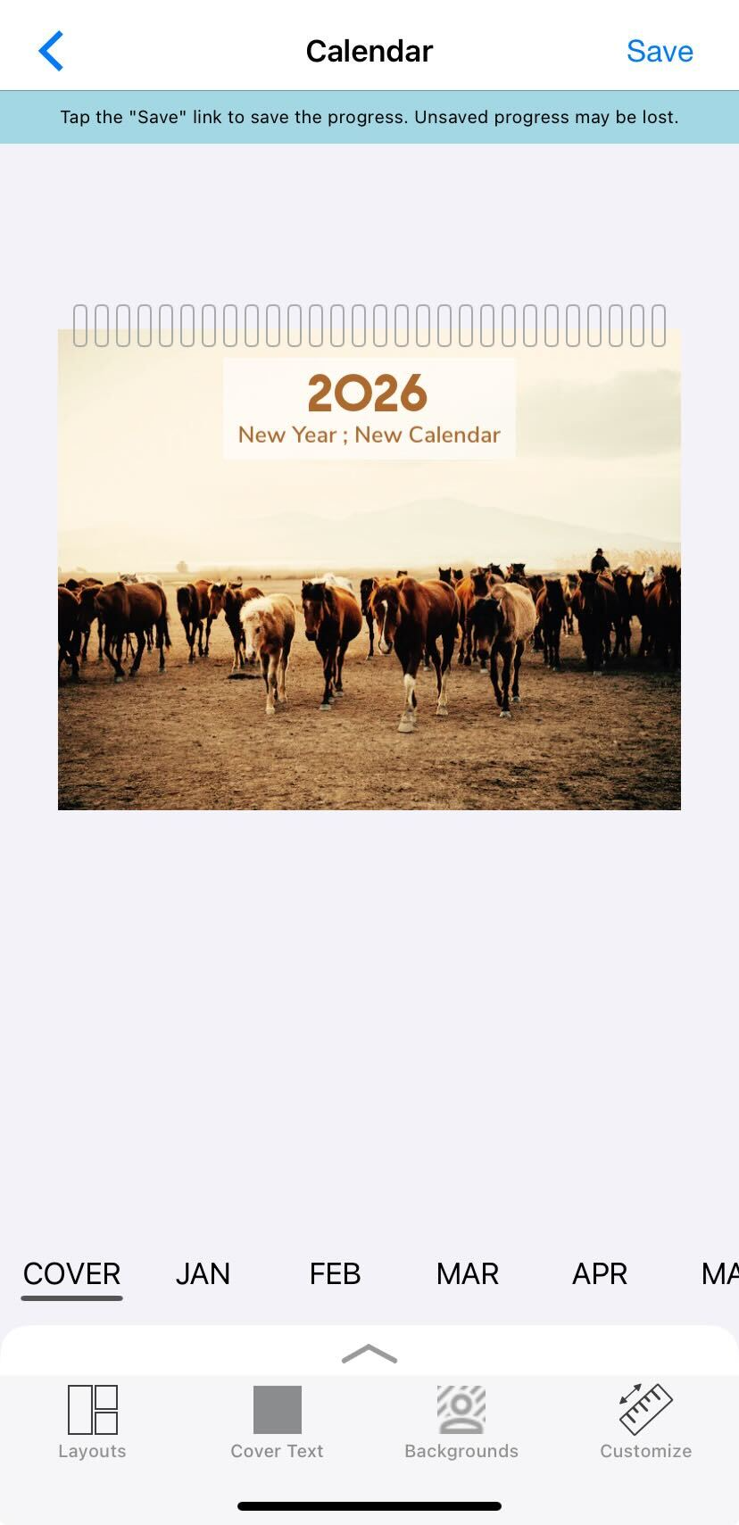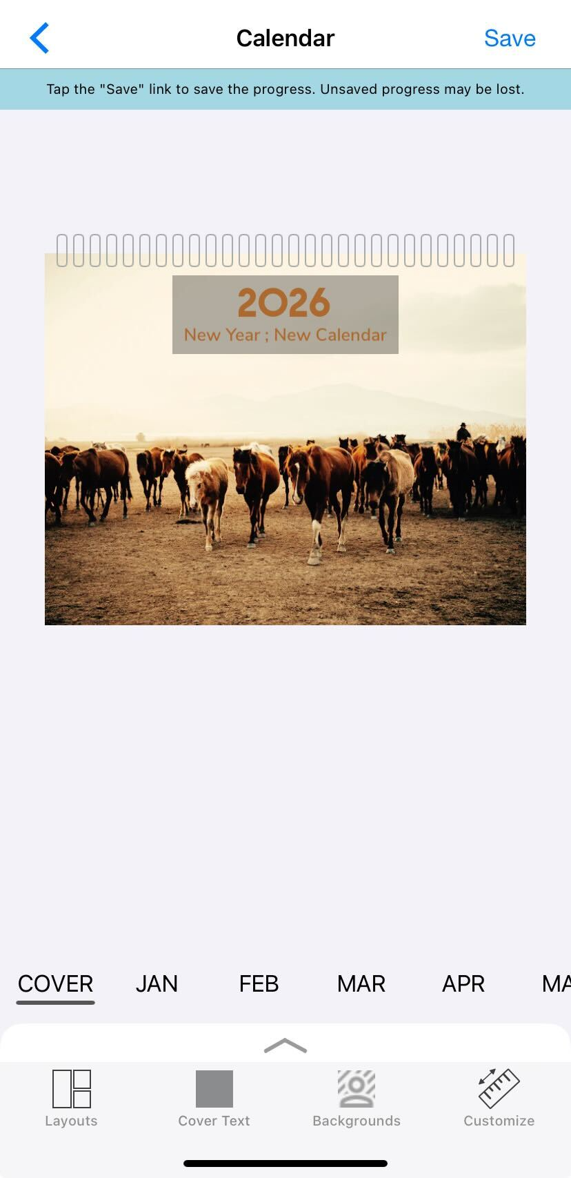 - When you are finished selecting your cover text options, tap the down arrow to close the menu and, once you have returned to the calendar cover, type in your cover text.