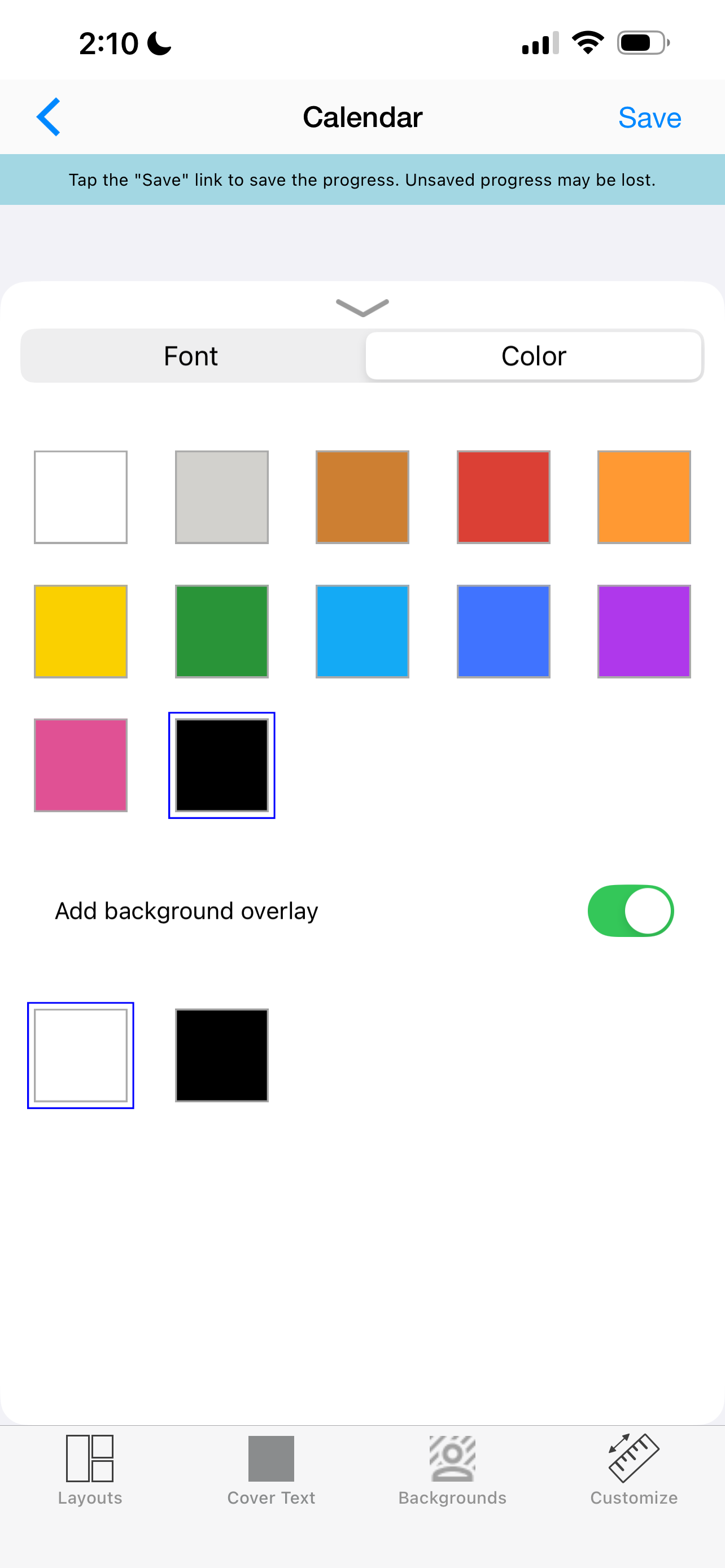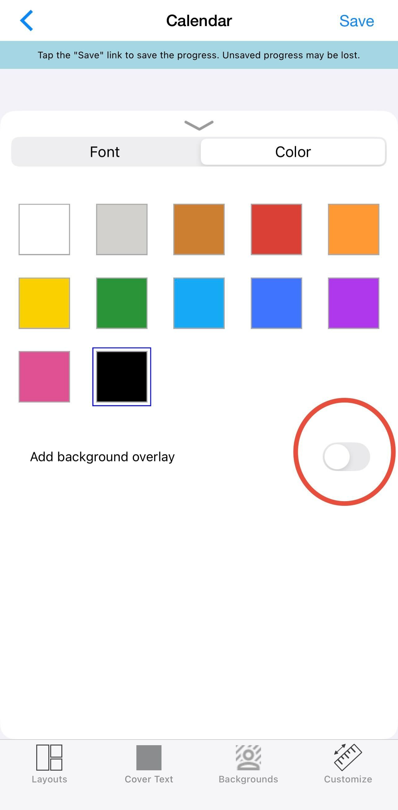 - You also have the option of removing the background overlay (or shadow box) if you prefer. Just tap on Cover Text > Color and toggle the Add background overlay to the off position.