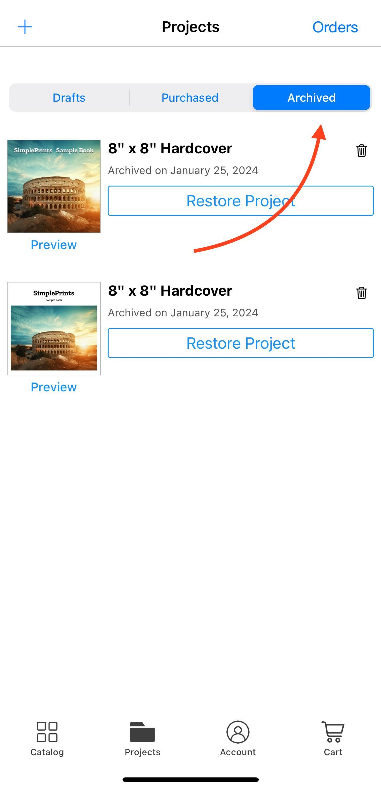 Auto-Archive is automatically applied and cannot be turned off from the app. If you would like to opt out, please contact us at hello@simpleprints.com. However, we do recommend keeping your older active projects and purchases to no more than 10 for optimal app performance.