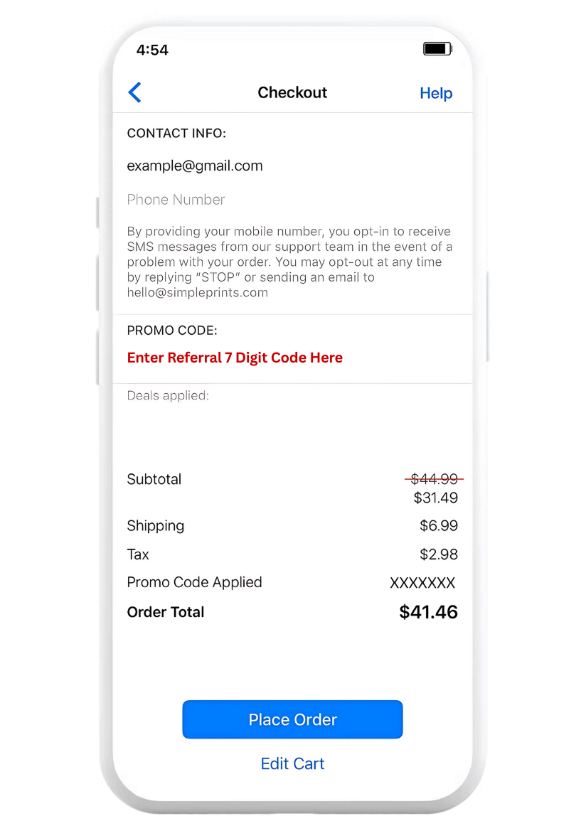 *Referral code can only be redeemed on your very first purchase with SimplePrints. If you have already placed an order with us, the code will not be valid.